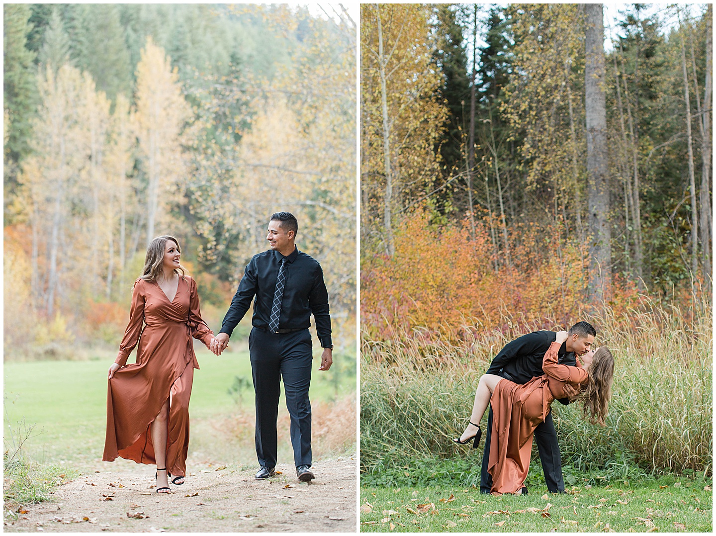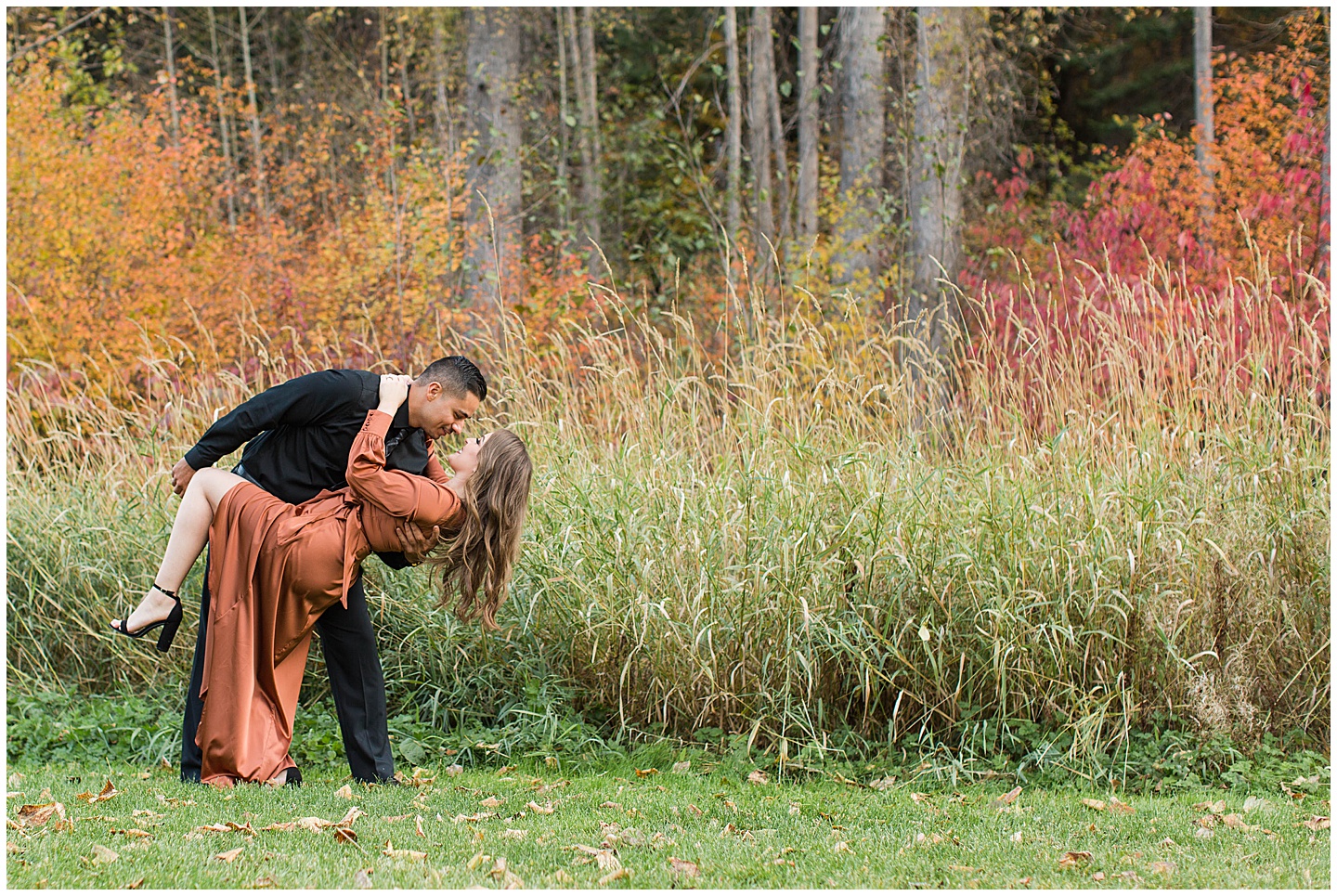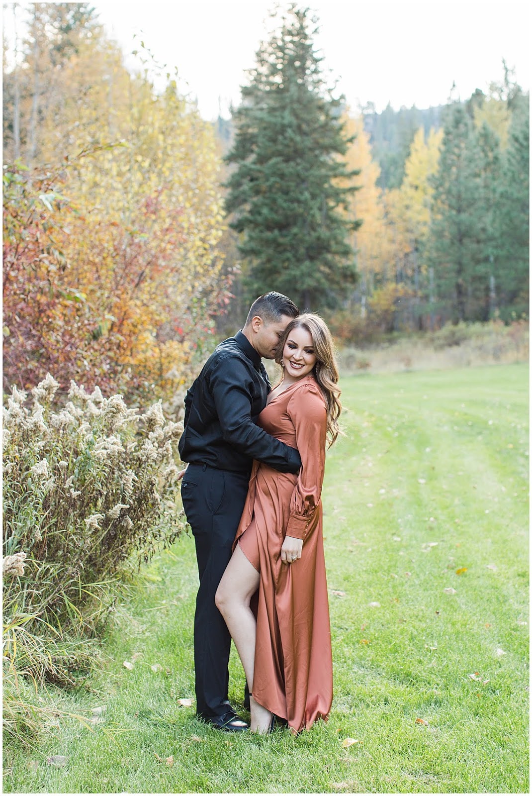 Some things that I absolutely love are, vintage/antique items, bright colors, being outside and autumn.The reason I’m telling you this is because all of that combined in perfection for this session!I love that Maribel chose a dress that had a vintage feel to it, and when I saw the dilapidated car on the property I knew it was going to be one of my favorite shots.The time I spent with these two was so enjoyable and from the very beginning they were just the sweetest couple and genuinely love being together.The cute comments and way they just naturally showed their relationship was the best.We were so far out in the woods that we even saw bear poop on the trail we were on-I had never seen that in real life before!Thankfully the closest we came to a bear was guard dog but that gives you an idea of the amazing location!I don’t exactly live close to this area but it was totally worth the drive to be able to hang out in such a serene setting.I hope you love these as much as I do!